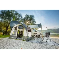 Das Busvorzelt Brunner A.I.R. Tech Trails LC ist ein freistehendes Buszelt mit aufblasbarem A.I.R. Tech Luftgerüst und einer Verbindungsschleuse mit direktem Zugang zum Fahrzeug. Dieses Vorzelt passt an Campingbusse mit einer Anbauhöhe (Regenrinne) von 180 – 220 cm. Mit diesem Zelt schaffst du einen zusätzlichen Wohnraum direkt vor dem Fahrzeug. Deine Privatsphäre kannst du ganz leicht selbst bestimmen, denn das A.I.R. Tech Trails LC hat grosse verdunkelbare Fenster. Das Busvorzelt ist durch das A.I.R. Tech Luftgerüst einfach auf- und abbaubar. Die Befestigung kann auf unterschiedlichste Weise erfolgen: mit Keder, mit Schleusenstab an der Regenrinne des Busses oder in der Dachreling. Im Lieferumfang sind Schleusenstab, Spannleinen, Heringe, Doppelhubpumpe und ein Packsack für einfachen Transport und Lagerung enthalten.