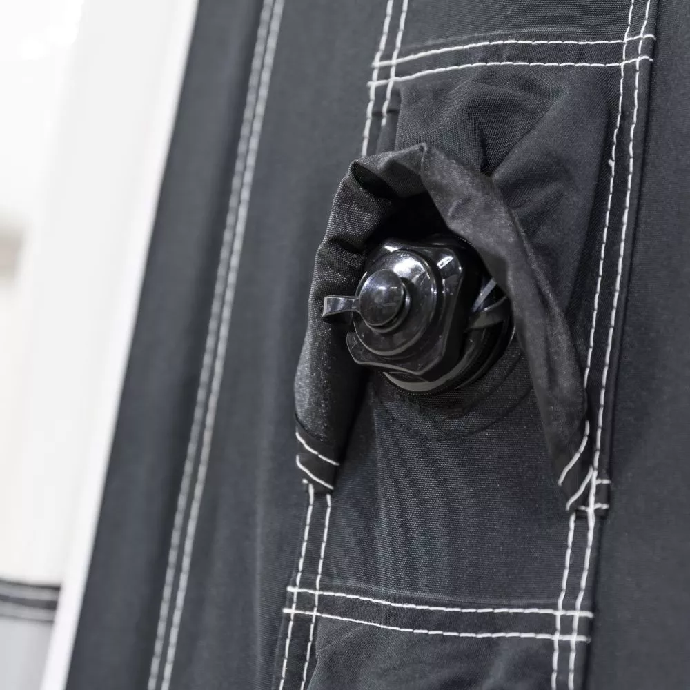 Die mitgelieferten Gardinen verschönern die Atmosphäre und geben ein Feeling wie Zuhause wieder. Am rechten Seitenfenster ist ein praktisches Moskitonetz angebracht. An sonnigen Tagen kannst du daher den Sommer geniessen, ohne von Fliegen gestört zu werden. Front- und Seitenwände können per Reissverschluss komplett abgenommen werden. Der so entstehende Verandaeffekt sorgt für Belüftung und entlastet das Zelt gleichzeitig. Ein integriertes aufblasbares Wetterschutzvordach mit Apex-Netzbelüftung ist ebenfalls enthalten. Das sogenannte Limpet-System ist ebenso enthalten. Mit vorgestanzten Löchern kann das Dometic Luftvorzelt an der Vorzeltrückwand des Fahrzeuges befestigt werden.