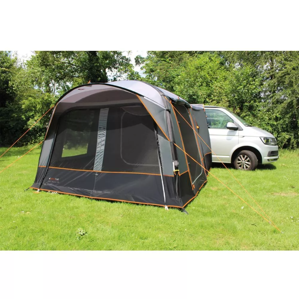 Das freistehende Busvorzelt Eurotrail San Marino Air mit einer Anschlusshöhe von 180 – 210 cm überzeugt mit praktischen Vordach über dem Eingang und grossem Panorama-Fenster mit Abdeckung. Es kann mittels Doppelkeder (7,5 mm und 6 mm), Schleusenstab oder Klettband an der Reling befestigt werden. Die mitgelieferte Pumpe anschliessen und innerhalb weniger Minuten steht das Eurotrail Bus-Vorzelt auf dem Campingplatz bereit. Ein praktischer Zeltboden ist rundum eingenäht.