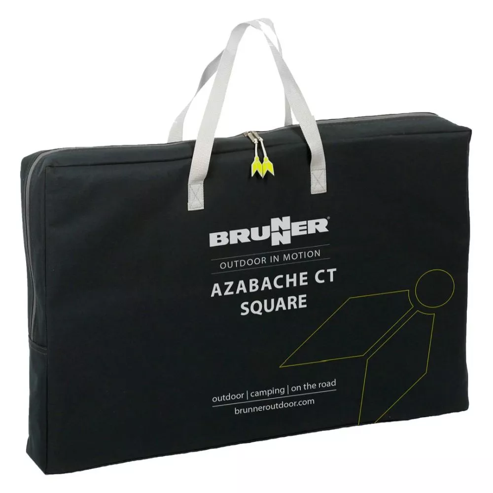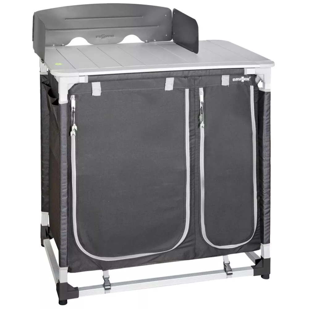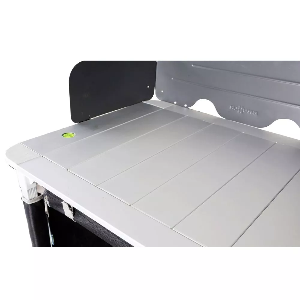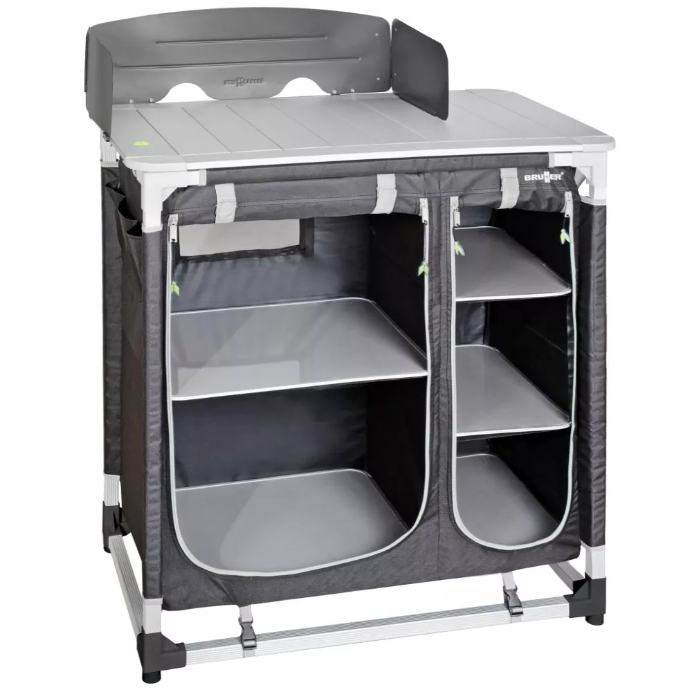 Mit einem stabilen vormontierten Rahmengestänge aus Aluminium und einem hochwertigen Bezug aus widerstandsfähigem Polyester erscheint der Camping-Küchenschrank Brunner Azabache CT Square. Die abriebfesten, aus Ripstop Polyester gefertigten Gestängekanäle des Bezugs, in dem rückseitig eine Lüftungsgaze eingearbeitet ist, sorgen für schnellen Auf- und Abbau. Die Ablageböden werden einfach eingelegt. Alle Drehteller-Füsse sind höhenverstellbar und bieten auch auf unebenem Untergrund einen sicheren Stand. Den oberen Abschluss der Küchenbox-Konstruktion bildet eine rollbare Alu-Arbeitsplatte. Zur weiteren Ausstattung des Brunner Azabache CT Square gehören seitliche Staufächer, ein Windschutz aus Metall und eine praktische Trage- und Aufbewahrungstasche.