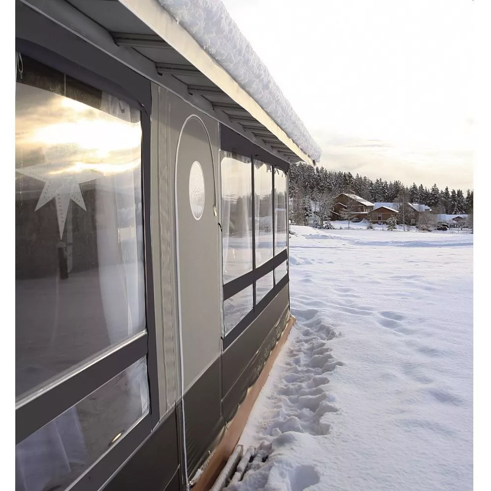 Die besonders hochwertigen Fensterfolien sind kältestabil und lassen sich ringsum durch Stoffklappen von aussen verschliessen. In beiden Seitenwänden befinden sich Gazelüftungsfenster, welche mit einer Folien- und Stoffabdeckklappe versehen sind. Mit dem Wohnwagen wird das Zelt durch eine Schleuse verbunden. Diese besteht aus einem angeschweisstem PVC Verbindungsstreifen am Dach und Andruckpolstern jeweils an der Seite. Die Rückwand verfügt über zwei Eckmodule in einer Breite von 70 cm. Der Wohnwagen kann jederzeit entfernt werden und das Zelt stehen bleiben. Hierzu kann ein zusätzliches Rückwandmodul bestellt werden, welches die Rückwand komplett schliesst. Die Verbindung zwischen Wohnwagen und Zelt lässt sich mit wenigen Handgriffen montieren und demontieren. So bleibst du flexibel!