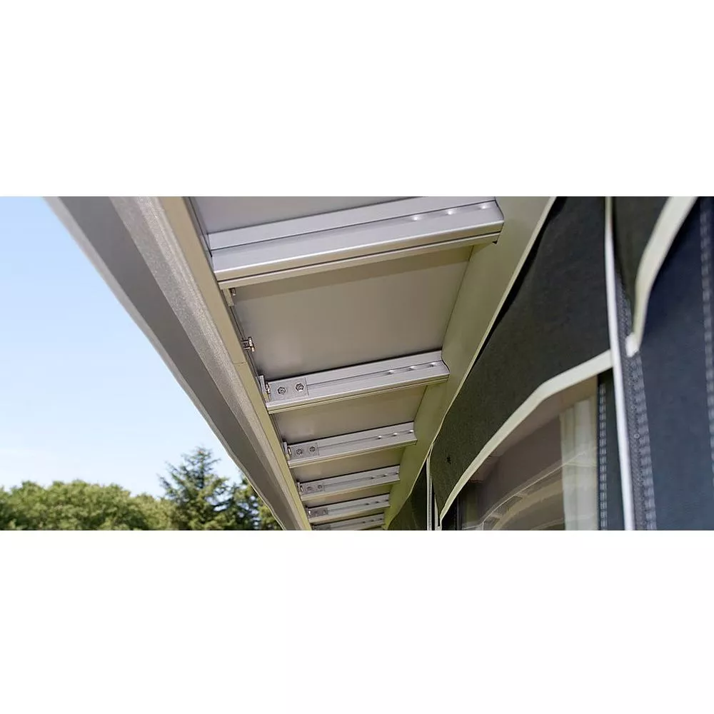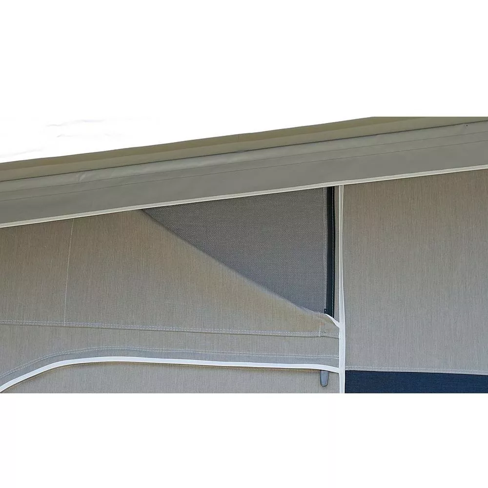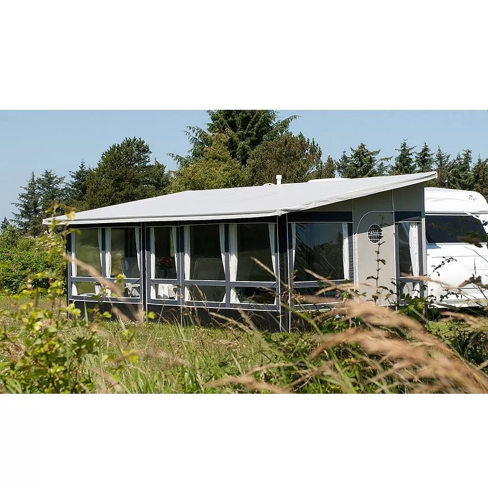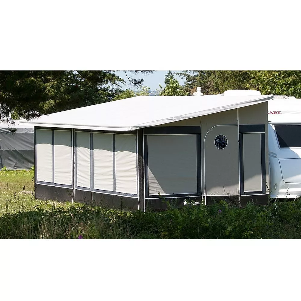 Die Seiten- und Vorderwände werden aus spinndüsengefärbtem Isacryl gefertigt. Dieses Material ist atmungsaktiv und sorgt somit für ein angenehmes Raumklima. Alle Elemente können individuell zusammengestellt werden und sind mit einem Reissverschluss untereinander verbunden. Dies ermöglicht es dir, dein ganz persönliches Zelt zu gestalten und erleichtert zudem den Aufbau. Auch der spätere Austausch eines einzelnen Elementes ist so möglich, ohne das ganze Vorzelt demontieren zu müssen. Das Dach wird aus beidseitig PVC-beschichtetem Polyestergewebe gefertigt. Um Schwitzwasser zu vermeiden, wird einen zusätzlicher Innenhimmel aus Baumwollmischgewebe empfohlen (Zubehör).