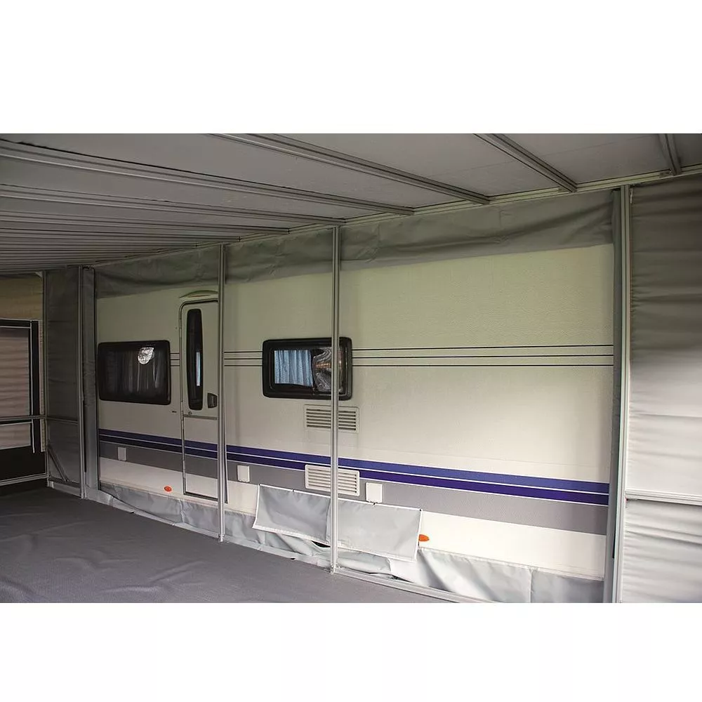 Durch die zwei Rückwandelemente ergeben sich folgende Öffnungen zum Wohnwagen: 550 = 410 cm, 650 = 510 cm, 750 = 610 cm, 850 = 710 cm, 950 = 810 cm. Die rückwärtige Höhe des Zeltes betägt 240 cm (zzgl. 10 cm Bodenpodest).Empfehlung: