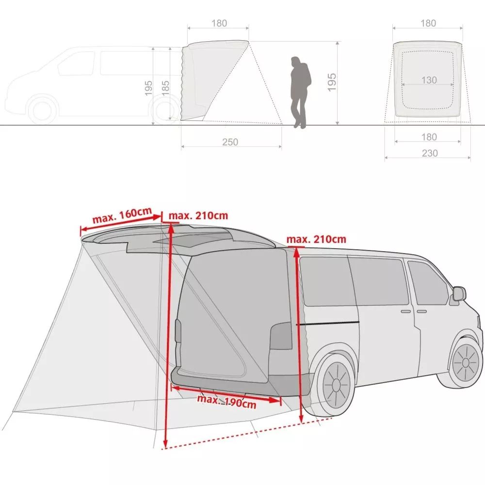 Die Idee ist so genial wie einfach – mit dem VAUDE Drive Van Trunk verwandelt sich die Kofferraumklappe und der sich unter und hinter ihr befindliche Raum blitzschnell in ein grosses Vorzelt! In Kombination mit dem Kofferraum selbst entsteht so viel Platz zum Schlafen, Kochen und Beisammensitzen. Das VAUDE Drive Van Trunk Heckzelt lässt sich dabei besonders vielseitig einsetzen – es passt sich durch seine raffinierte Abspanngurt-Konstruktion verschiedenen Autotypen an und lässt sich auf beiden Seiten aufklappen. Das Vorzelt kann so an Fahrzeugen in VW Bus-Grösse und Kastenwagen wie z.B. den VW Caddy montiert werden und verwandelt den Van in ein Campingmobil. Die geöffnete Kofferraumklappe bildet dabei das tragende Element der Zeltkonstruktion und ermöglicht durch die so entstehende Stehhöhe ein verrenkungsfreies Umziehen oder sogar Duschen mit der nötigen Privatsphäre. Der Platz im Vorzelt bietet reichlich Stauraum oder sogar Platz zum Kochen und Essen mit zwei Stühlen und einem kleinen Tisch. Das Zelt am Kofferraum sorgt für eine optimale Belüftung im sicheren Fahrzeugraum und bietet dabei die nötige Privatsphäre.