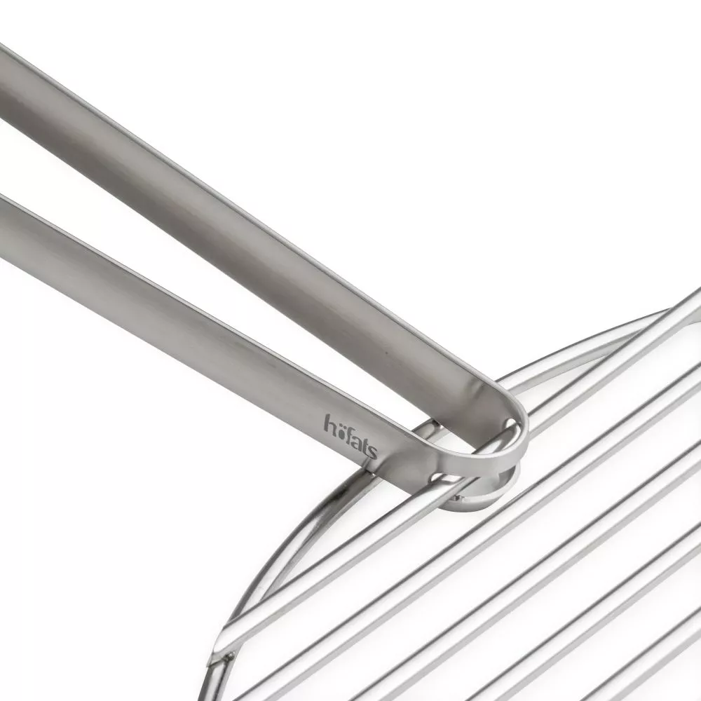 Durch die symmetrische Form der Höfats Grillzange liegt sie ergonomisch und sicher in der Hand. Die leicht schräg gestellten Flanken ermöglichen zudem, empfindliche Ware behutsam zu greifen. Ausbrüche an den Enden sorgen dabei für Grip und Durchblick – sie verleihen der Zange gewissermassen Transparenz im Bereich des Geschehens, was sie sowohl für kleine Garnelen als auch für Steaks zum perfekten Zubehör macht. Doch damit nicht genug: mit dieser Zange wird der Grillrost über die Glut gelegt oder umgekehrt der heisse Rost aus dem Grill gehoben.