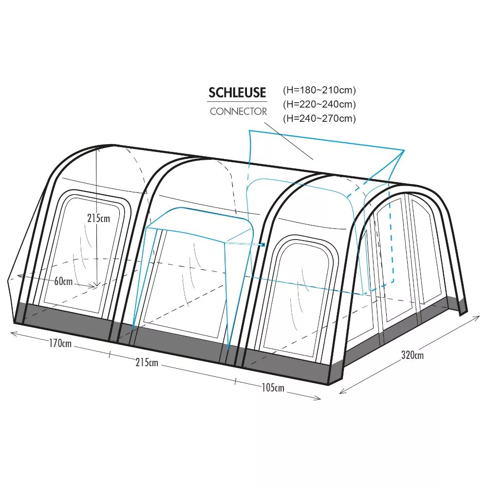 Die separat erhältlichen Schleusen mit einer Anbauhöhe von 180 bis 270 cm und das optionale Sonnendach können sowohl links als auch rechts angebaut werden. Auch die Vorderwand kann an zwei verschiedenen Stellen eingesetzt werden. Ausserdem lässt sich das Aquila Pro auch ohne Fahrzeuganbindung als Familienzelt nutzen. Dabei kann der sehr grosse Innenraum auf unterschiedlichste Weise genutzt werden – egal, ob du zusätzliche Schlafplätze oder ein grosses (Vor-)Zelt benötigst.