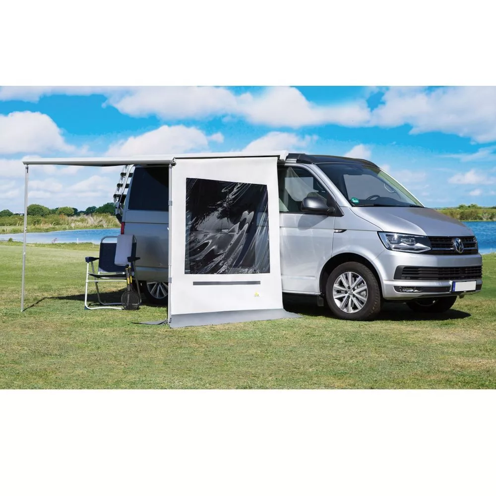 Die Markisen-Seitenwand besteht aus robustem PVC-beschichtetem Polyestergewebe und hält Regen, aber auch Sonne fern. Du kannst diese wahlweise rechts oder links anbringen. Alle DWT Rain Outside Seitenwände für Campingbusse besitzen am unteren Ende einen doppelten Erdstreifen, der Verschmutzungen fernhält. Jede Markisenseitenwand hat ein getöntes Folienfenster und reduziert somit die Durchsicht ins Innere des Markisenzeltes. Trotz der Tönung fällt genügend Tageslicht ins Innere und verleiht dem Ausblick ein angenehmes Licht.