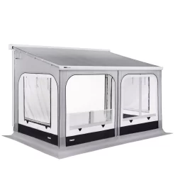 Das Markisenzelt Thule Panorama für die Thule Omnistor 6200/6300 Markise besteht wie das bewährte Safari Residence aus einer Vorderwand und zwei Seitenteilen. Es bietet die gleiche hervorragende Stabilität und ist genauso leicht aufzubauen. Die Vorderwand wird einfach in die Frontleiste der Markise eingeschoben und mit den Seitenwänden, die durch ein Klemmprofil am Markisentuch befestigt werden, mittels Reissverschluss verbunden. Durch die grossen Panoramafenster ist für mehr Lichteinfall und besseren Blick nach draussen gesorgt. Die Frontfenster können vertikal geöffnet, als Tür, oder horizontal geöffnet, zum Lüften, genutzt werden. Alle Teile sind vollständig abnehmbar. Für ausreichende Belüftung ist dank der beiden in den Seitenwänden integrierten Belüftungsstreifen auch bei geschlossenem Zelt gesorgt. Beide Seitenfenster sind zudem mit Moskitonetzen ausgestattet. Das Markisenzelt Thule Safari Panorama ist aus Airtex gefertigt, einseitig mit Acrylat beschichtet und mit einem teflonbasierten Finish imprägniert. Durch die Fungizidbehandlung wird das wasserabweisende, waschbare Material wirksam vor Pilz- und Schimmelbefall geschützt. Lieferbar in zwei Höhen, Höhe medium wird bei einer Montagehöhe von 2,3 – 2,44 m (gemessen von der Unterkante der Markisen-Kassette bis zum Boden), Höhe large bei einer Montagehöhe von 2,45 – 2,59 m benötigt. Die Lieferung erfolgt inklusive Packtaschen und Wagenschürze.