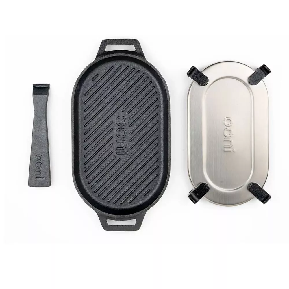 Wir präsentieren: die Ooni Grillpfanne! Diese Pfanne verbindet die Vielseitigkeit einer Servierpfanne mit den markanten Erhöhungen einer Griddlepfanne. Die Grizzler-Pfanne von Ooni hilft bei der Zubereitung köstlicher Fleisch-, Fisch- und Gemüsegerichte und hinterlässt die typischen Grillspuren auf deinen Zutaten. Wer ein Steak aus der gusseisernen Grillpfanne erst einmal probiert hat, wird nie mehr darauf verzichten wollen. Die Ooni Gusseisenpfanne hat einen abnehmbaren Griff. Dieses Zubehör wird zusammen mit einem Untersetzer aus rostfreiem Stahl geliefert.