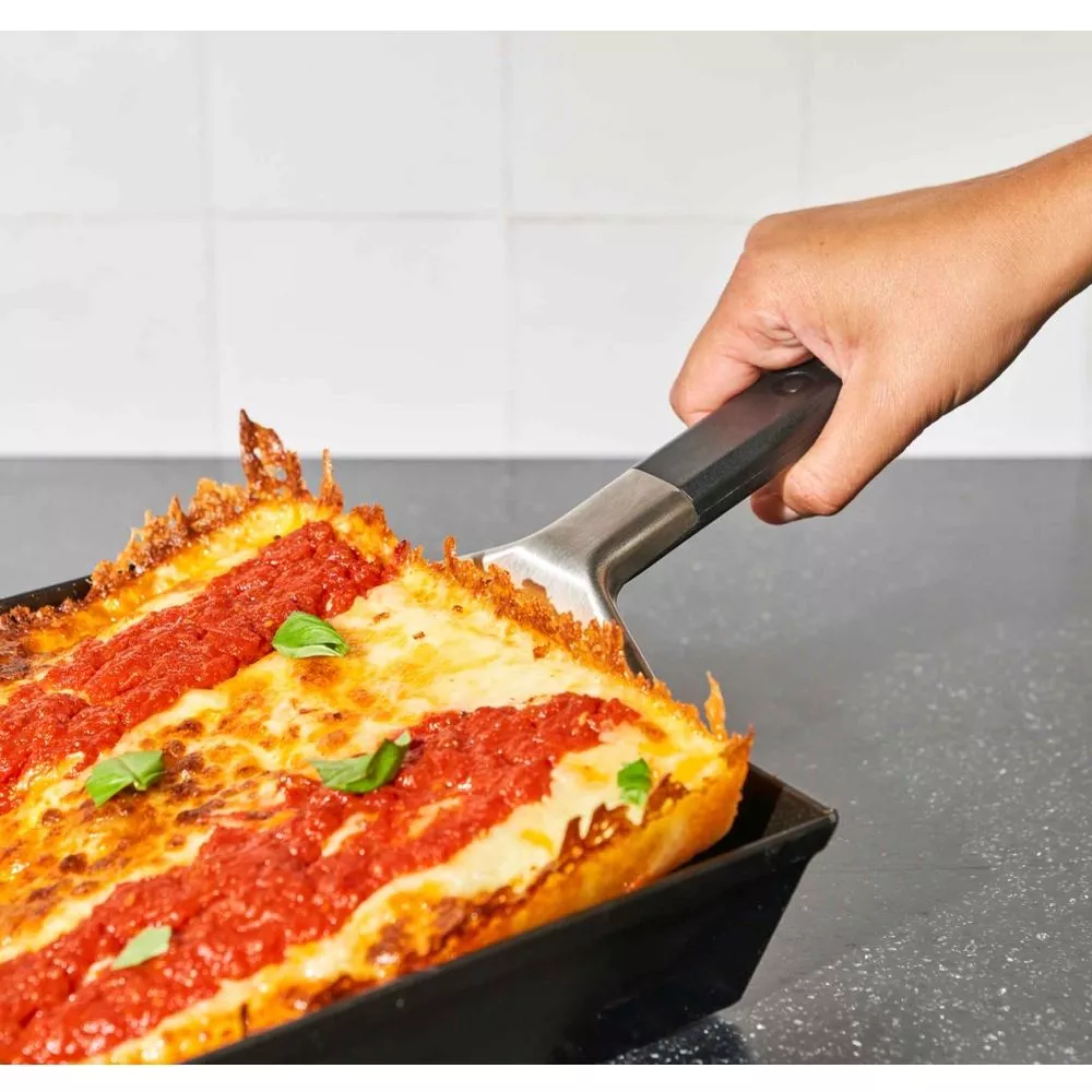 und Pizzen mühelos aus dem Blech zu holen - eleganter, wasserfester, ergonimischer Griff, der bequem in der Hand liegt