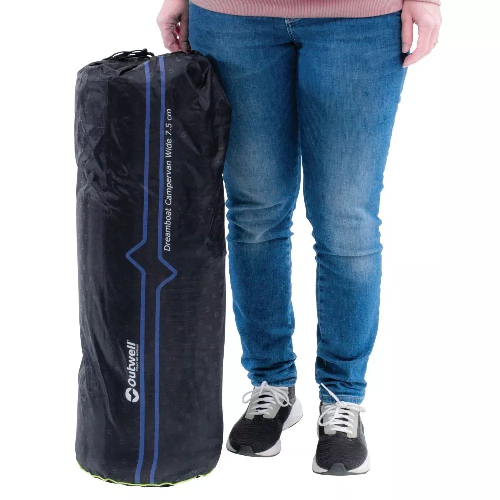 Bei der Campingmatte Outwell Dreamboat Campervan Wide handelt es sich um eine weiche und sehr komfortable selbstaufblasbare Liegematte für 2 Personen. Passend für Fahrzeuge wie den VW California oder den Mercedes Benz Marco Polo. Diese selbstaufblasende Liegematte ist mit dem Outwel FHF-Ventil (Flat High-Flow Valve) ausgestattet – einem flachen Ventil, das sowohl beim Aufblasen als auch beim Ablassen der Luft einen hohen Luftstrom ermöglicht. Die Seitenwände aus Textil biegen sich unter Druck nicht durch, wodurch sich das Aufblasen einfacher gestaltet, weil weniger Luft zugeführt werden muss. Darüber hinaus sorgt die Matratzenkonstruktion mit ihrem tiefen Profil und ihrer Extrabreite für einen Komfort, den die Camper sonst nur von daheim kennen. Abgerundet wird dieses überzeugende und überaus komfortable Produkt durch beste Dämmwerte. In Anbetracht ihrer Abmessungen besitzt diese Doppel-Liegematte ein verhältnismässig geringes Gewicht und ein relatives kleines Packmass.
