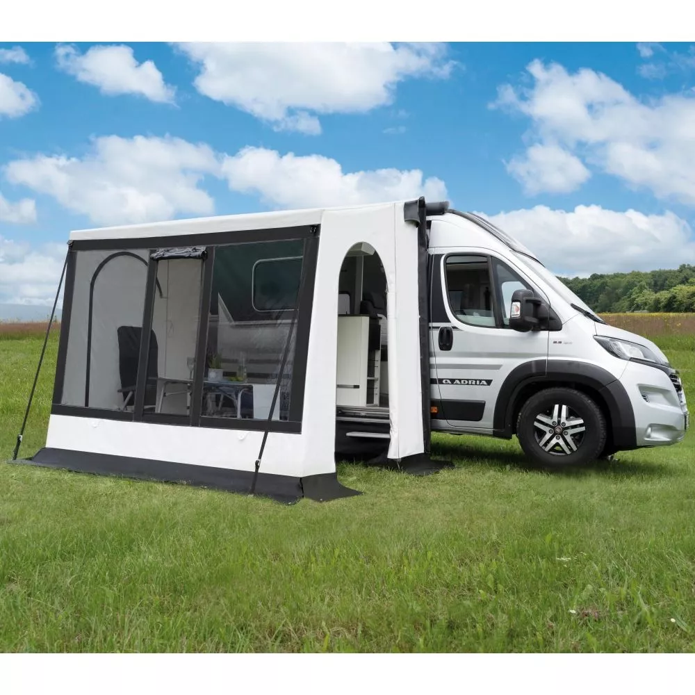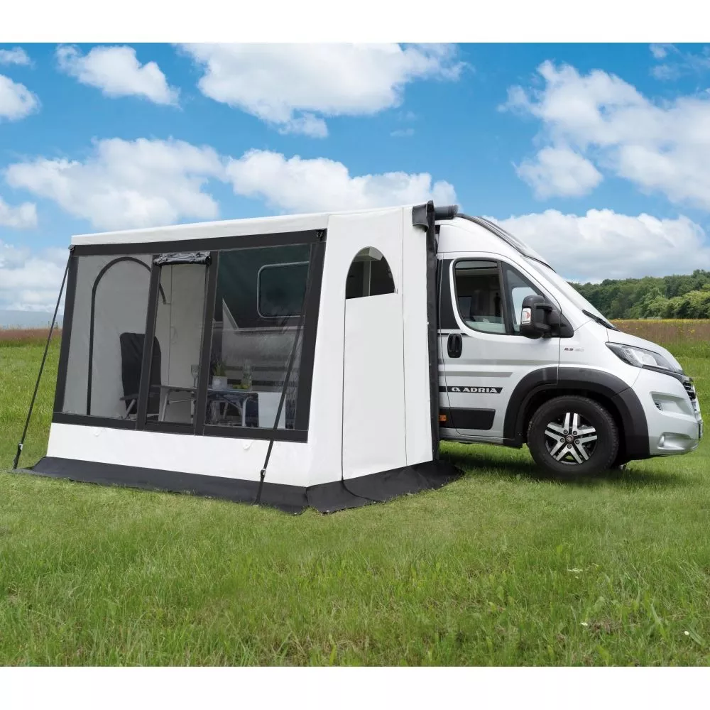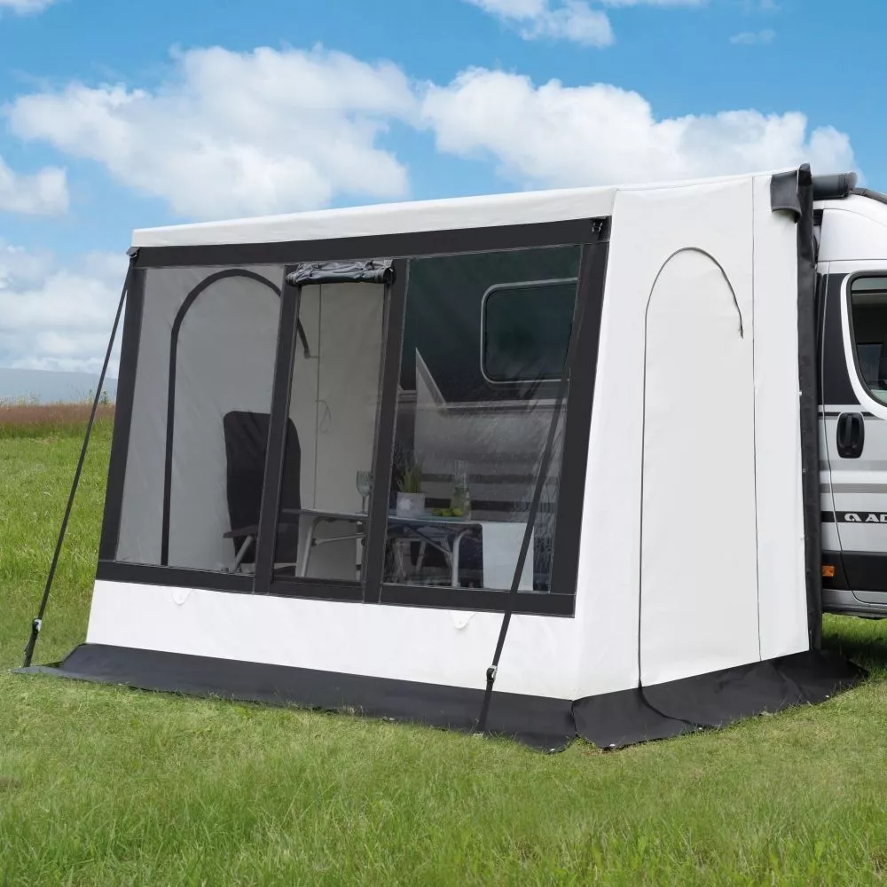 Mit einer Anschlusshöhe von bis zu 265 cm passt es ideal an Kastenwagen. Am Fahrzeug kann das INUIT Polar entweder direkt an der Markise oder über eine Schleuse befestigt werden. Alternativ kann es aber auch freistehend aufgestellt werden. Dank der beiden gegenüberliegenden Seiteneingänge gelangst du schnell und einfach in dein Vorzelt. Die Front ist mit getönten Fenstern und einem Air Vent Fenster ausgestattet, wodurch dir ein schöner Panoramablick in die Natur geboten wird.